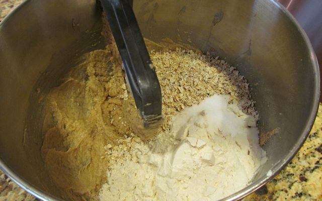 Next add the flour, salt, baking soda and oats. You can mix these first in a bowl and then add to the butter mixture but I just dump it all in and let the mixer do the work. Mix just until combined.